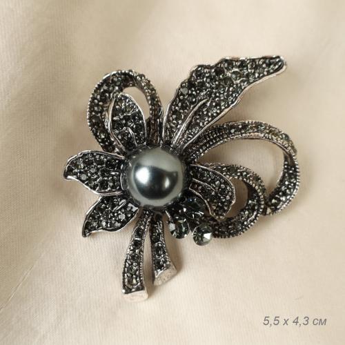 Брошь Бант с цветком 5,5 см / LT14-12 /уп 48/ черненое/ с жемчугом