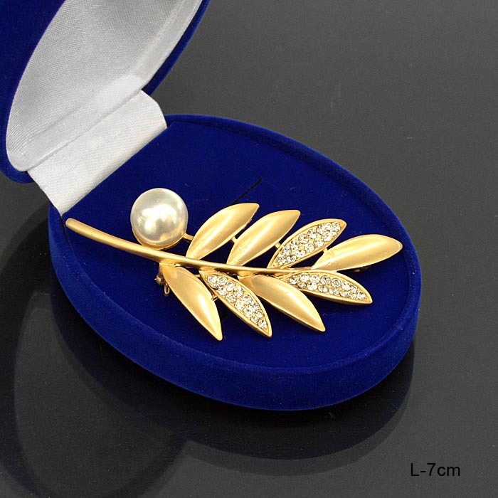 Брошь Лист 7 см / 59-13/1/ /уп 12/ с жемчугом/ золото