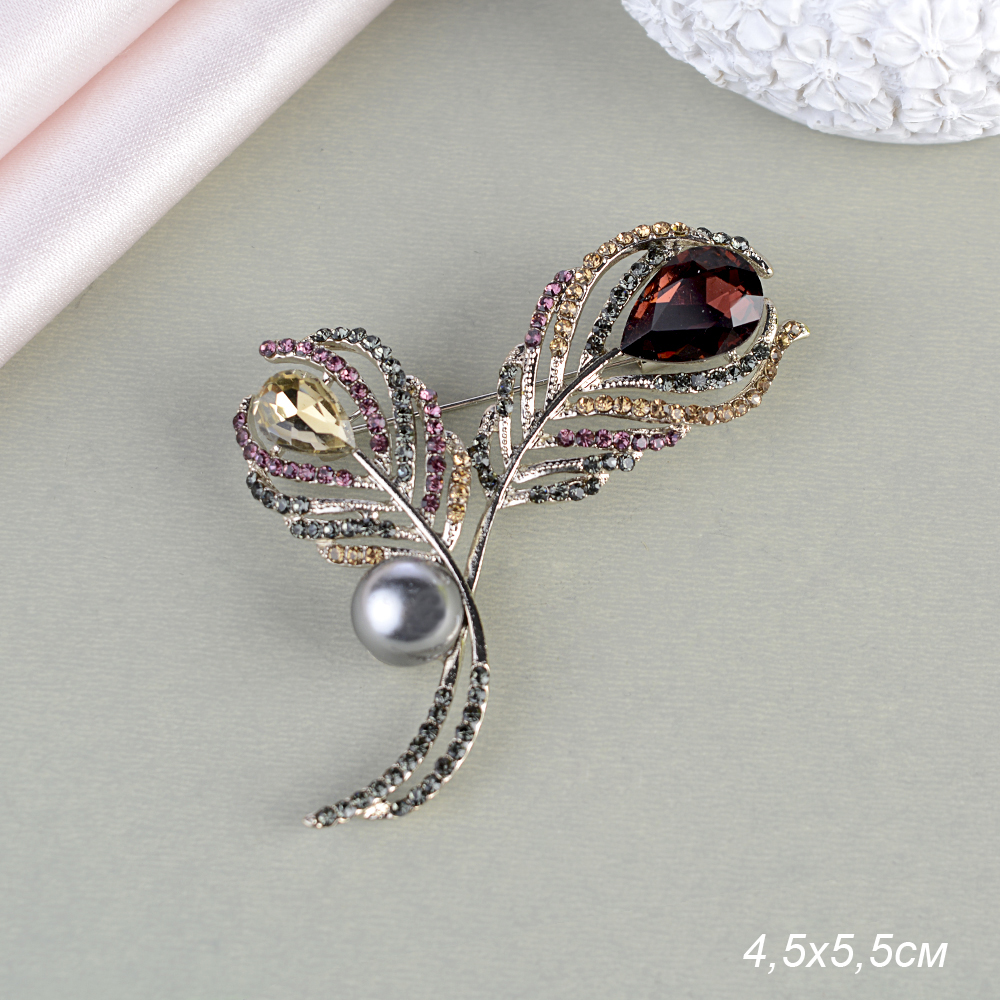 Брошь Перья павлина 5,5 см / GM273-49 /уп 24/ с жемчугом