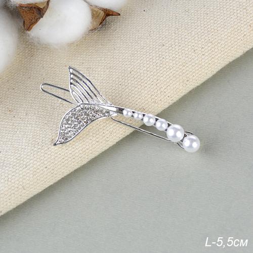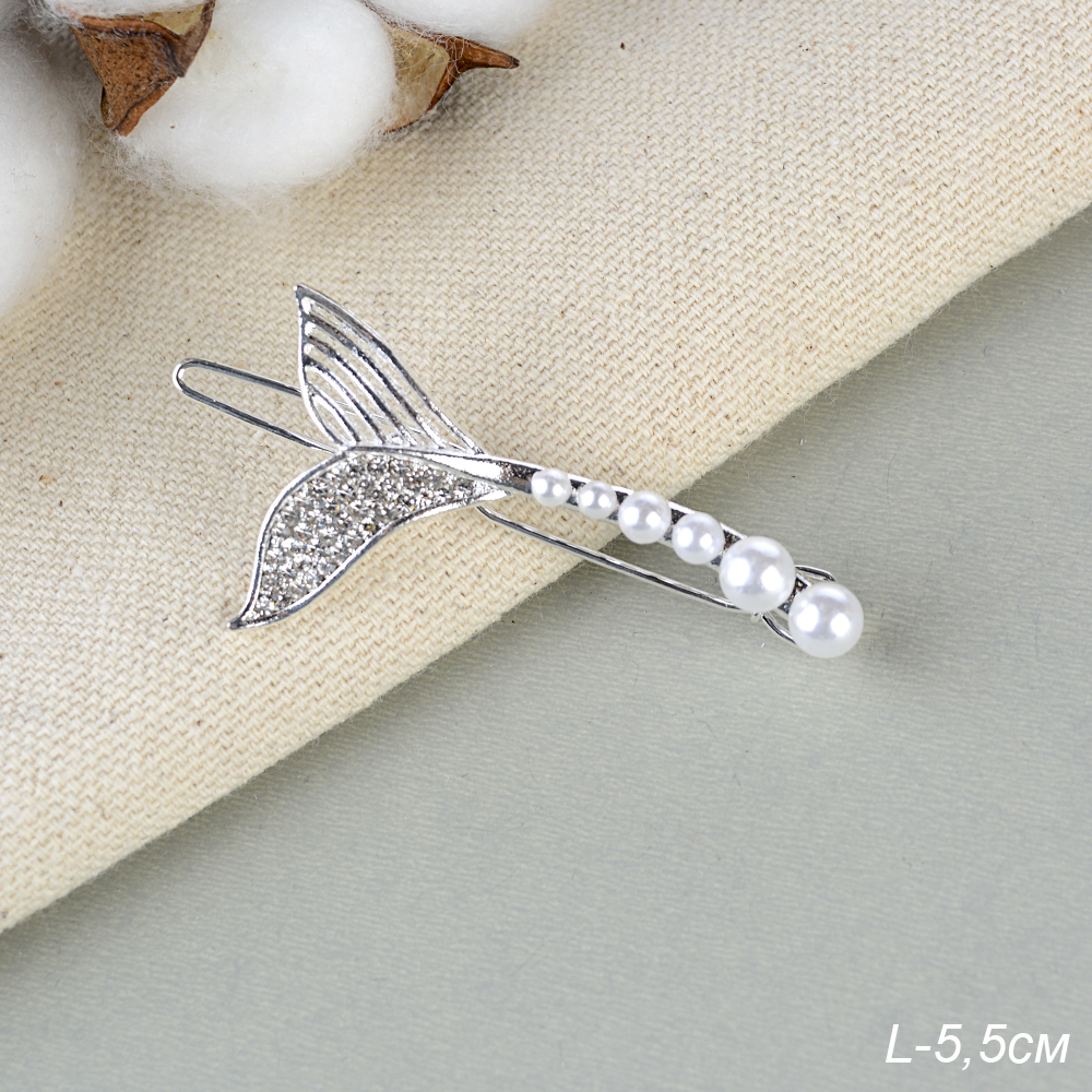 Заколка-зажим для волос 5,5 см / 2125-30 /уп 12/серебро/жемчуг/стразы