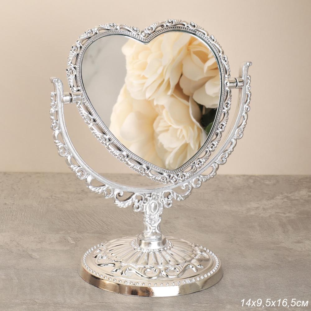 Зеркало настольное ажурное двустороннее 16,5 см сердце / YDW-06 /уп 72/серебро