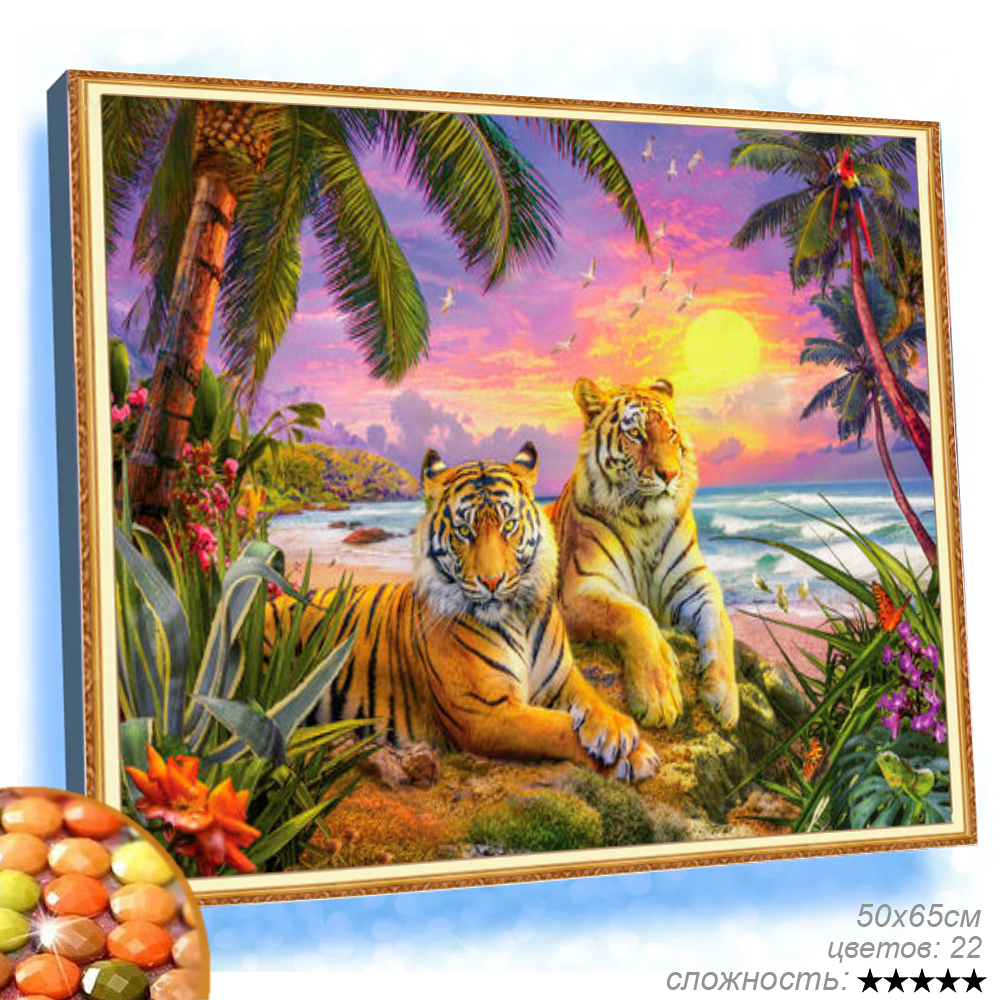 Алмазная мозаика на подрамнике 50x65 Тигры под пальмой / YSG1845 /уп 20/полное заполнение