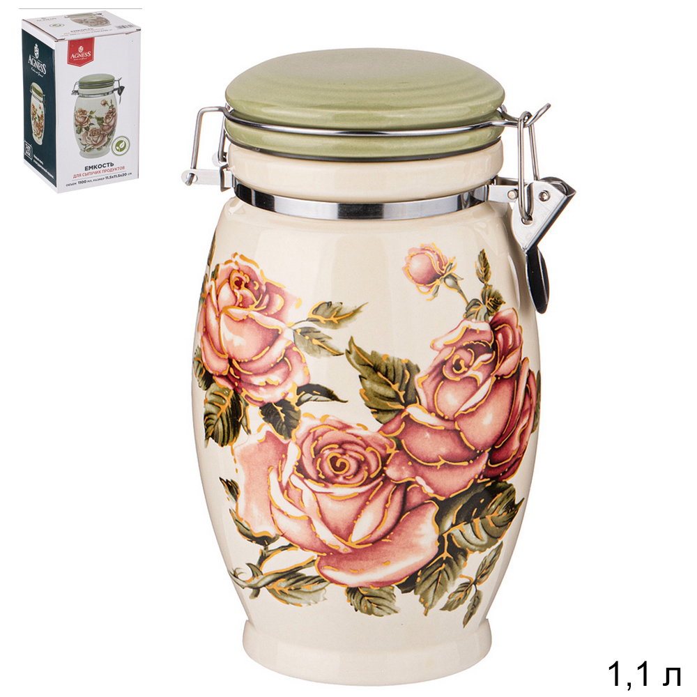 Банка для сыпучих продуктов Корейская роза 1100 мл / 358-524 /уп 18 /с клипсой/11,5x11,5x20 см