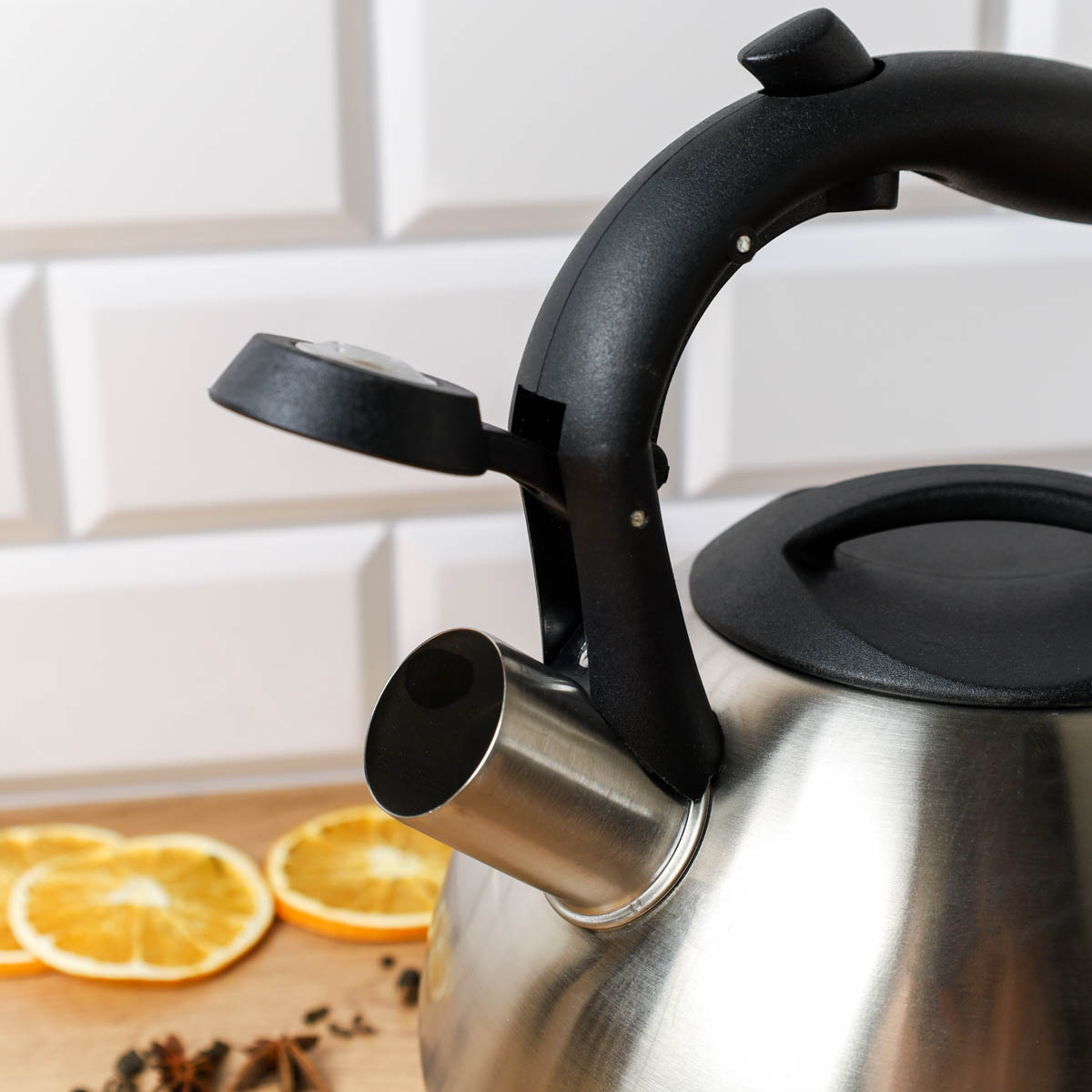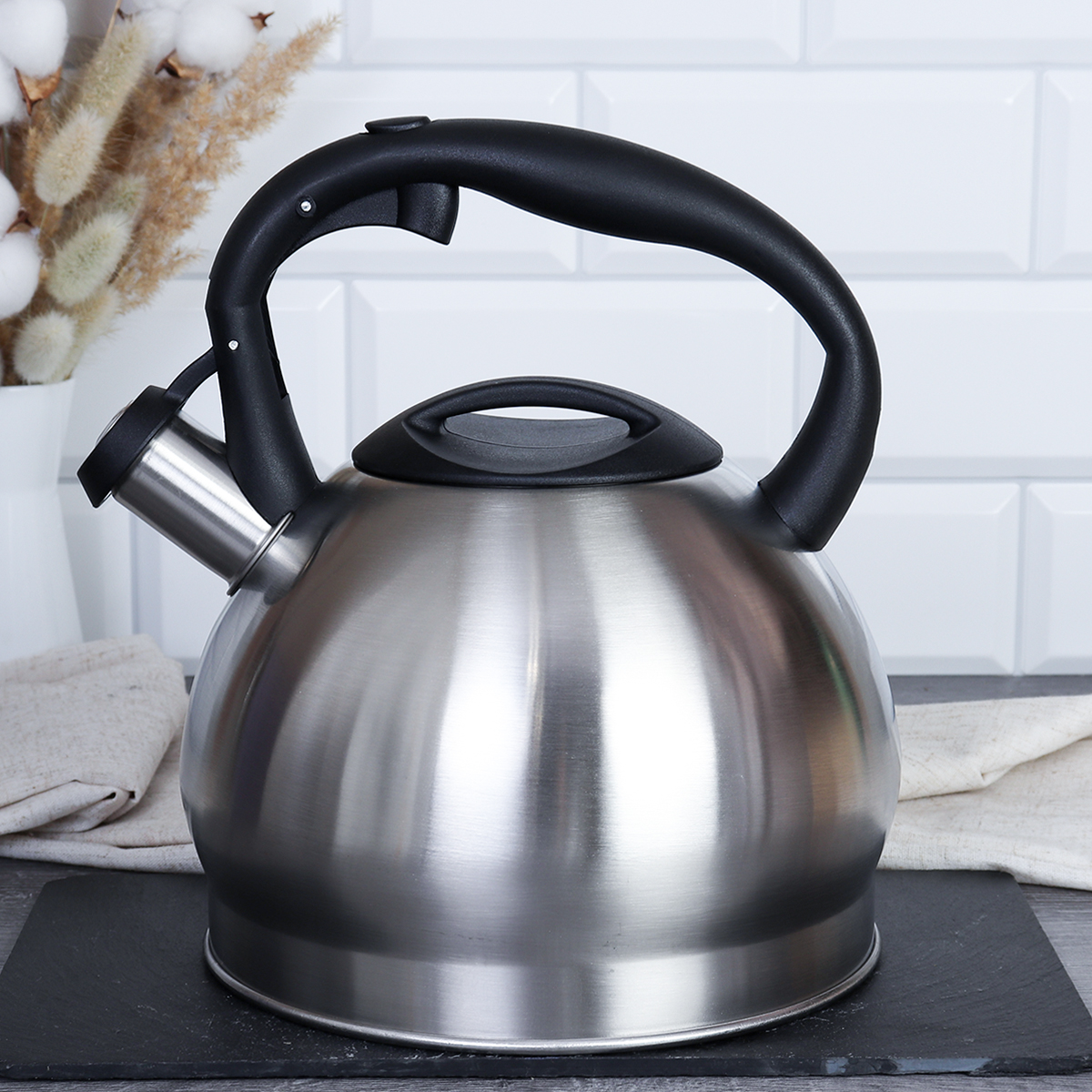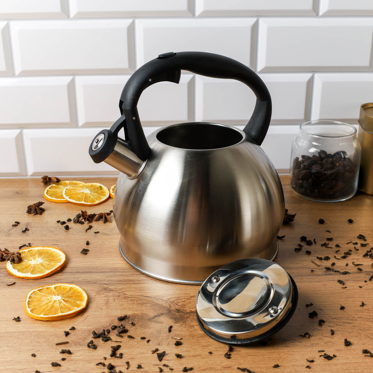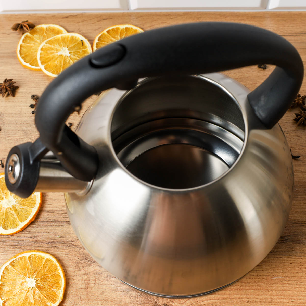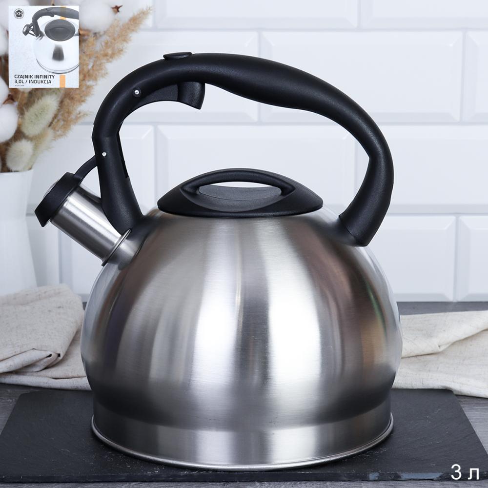 Чайник 3 л из нержавеющей стали с бакелитовой ручкой. Имеет однослойное дно. Подходит для всех видов плит.