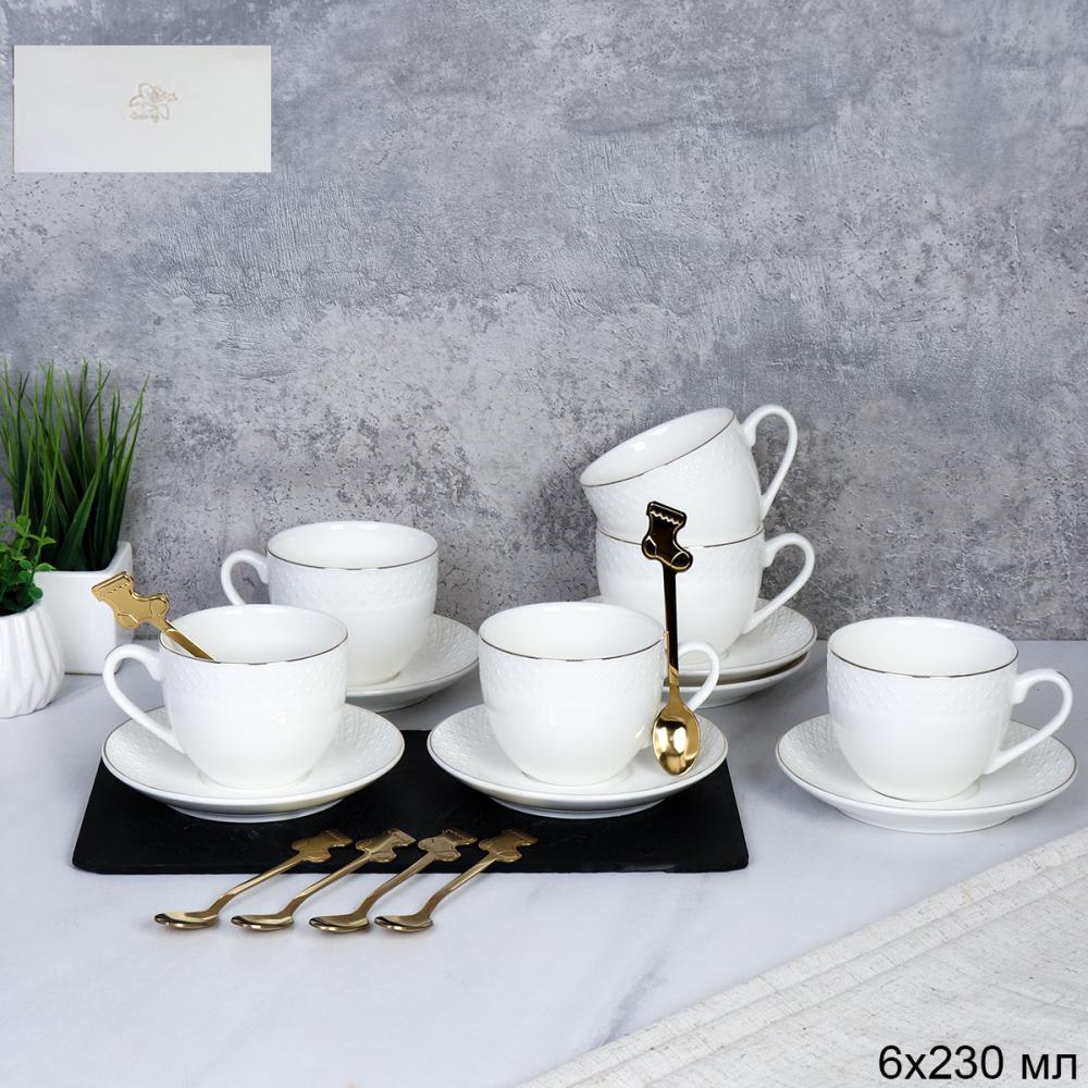 Чайный набор 12 предметов 230 мл / GA7-12G 230 /уп 8/ костяной фарфор с ложками Сапожок золото