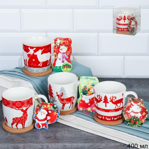 Подарочный набор Кружка новогодняя 400 мл с подставкой под горячее / H012/ в подарочной коробке PVS/АКЦИЯ