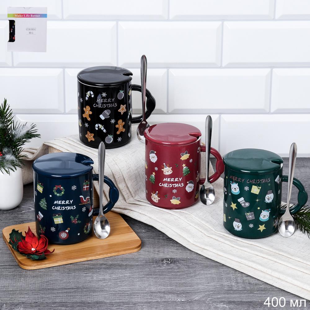 Кружка новогодняя с крышкой керамической и ложкой 400 мл/ XI108-3 /уп 60/