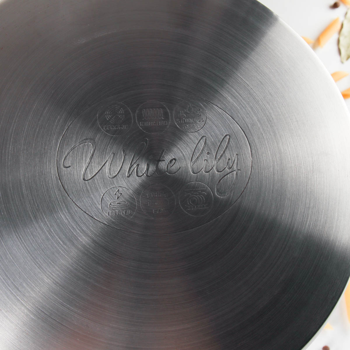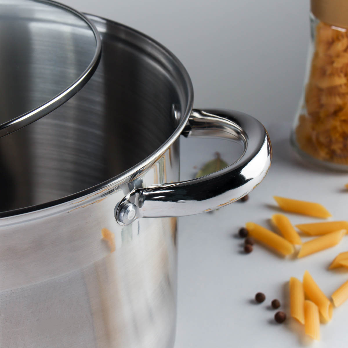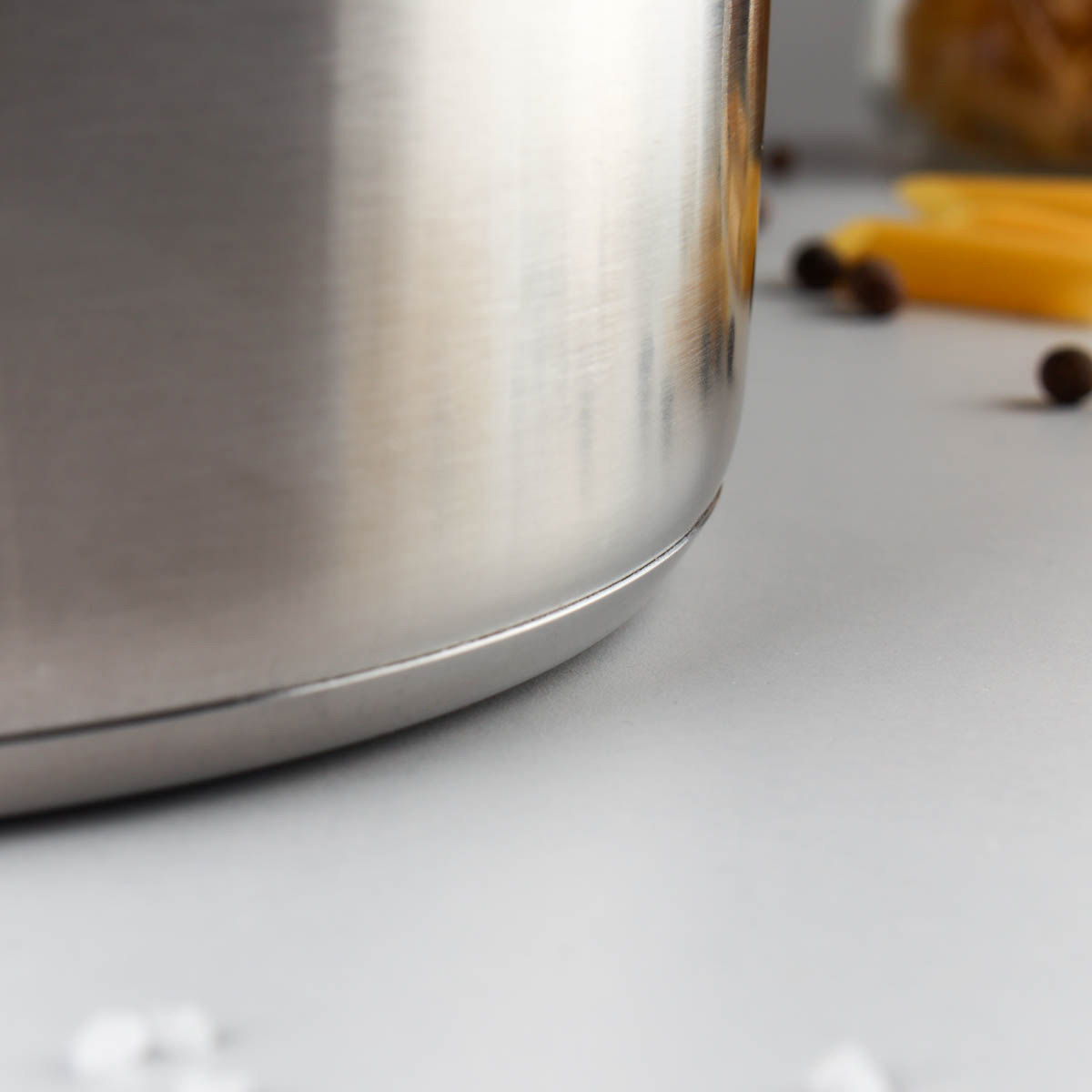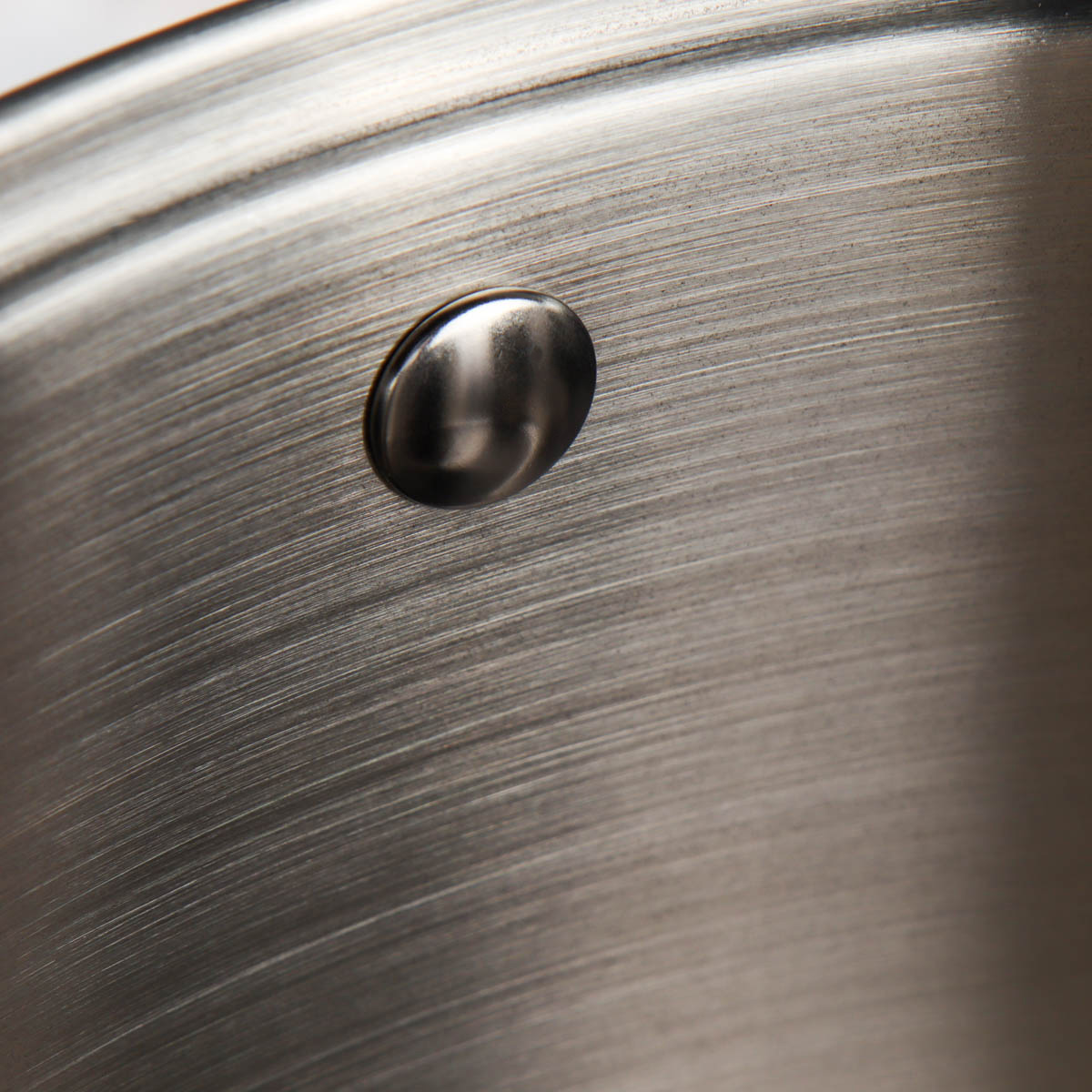 Кастрюля имеет 5-слойное дно. Чередование слоев стали и алюминия обеспечивает равномерное ускоренное нагревание. При изготовлении наших кастрюль используется высокоуглеродистая сталь, которая устойчива к воздействию кислот и щелочей, а также к истиранию.