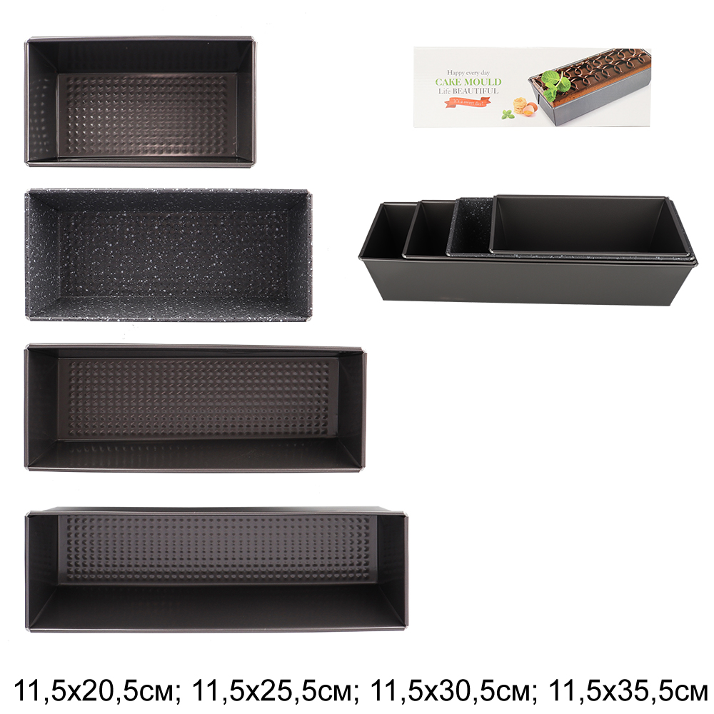 Набор форм для выпечки кексов и хлеба имеет антипригарное покрытие. Размеры: - 35,5х11,5 см - 30,5х11,5 см - 25,5х11,5 см - 20,5х11,5 см
