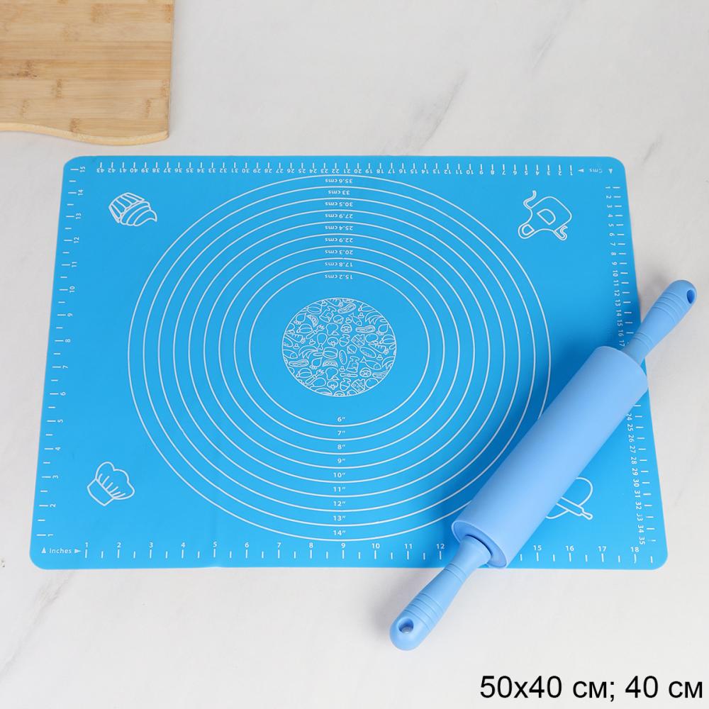 Силиконовый коврик 50х40 см и скалка 40 см Набор 2 пр / GY-633-E+GR-476 Голубой