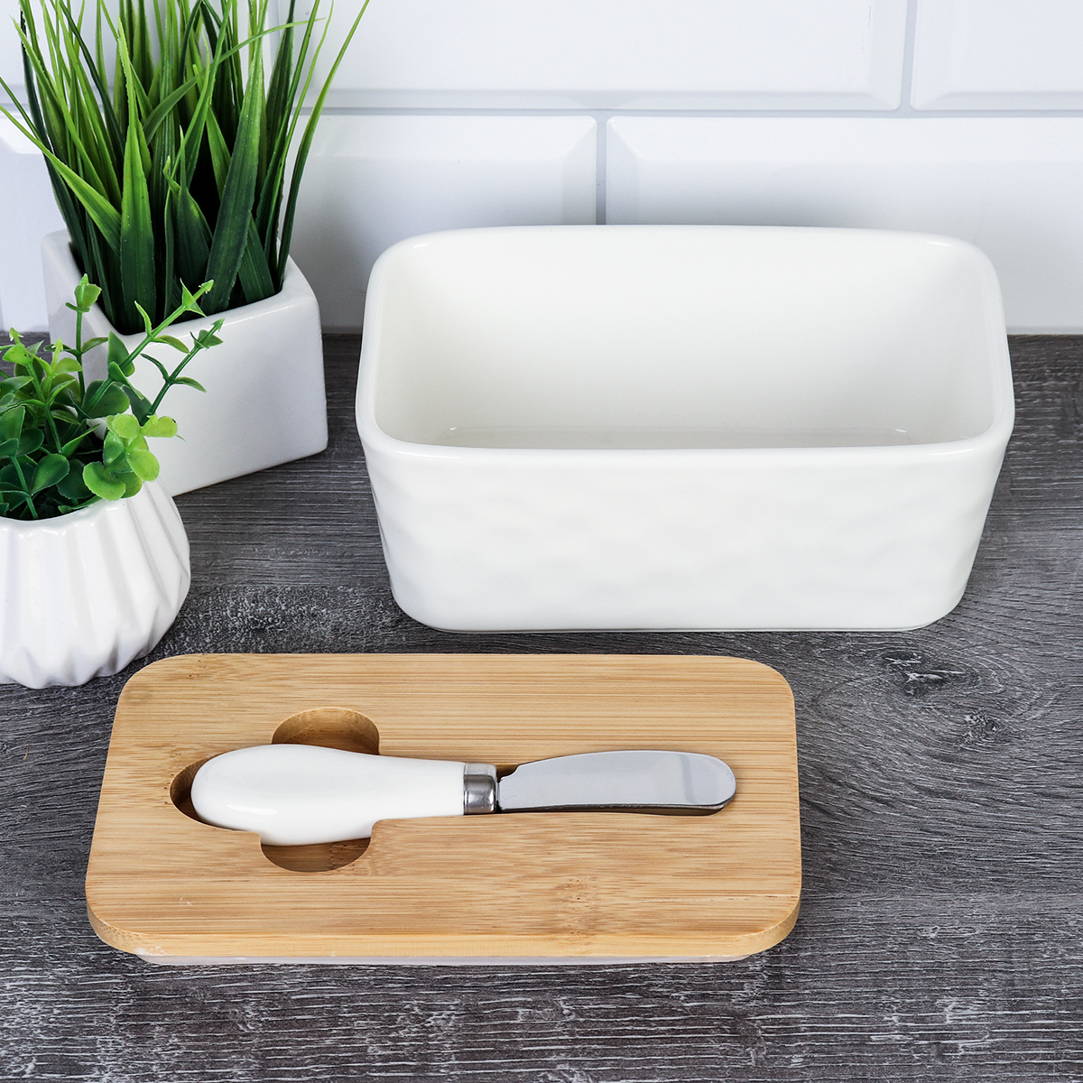 Керамическая масленка с ножом 13 см на деревянной крышке.