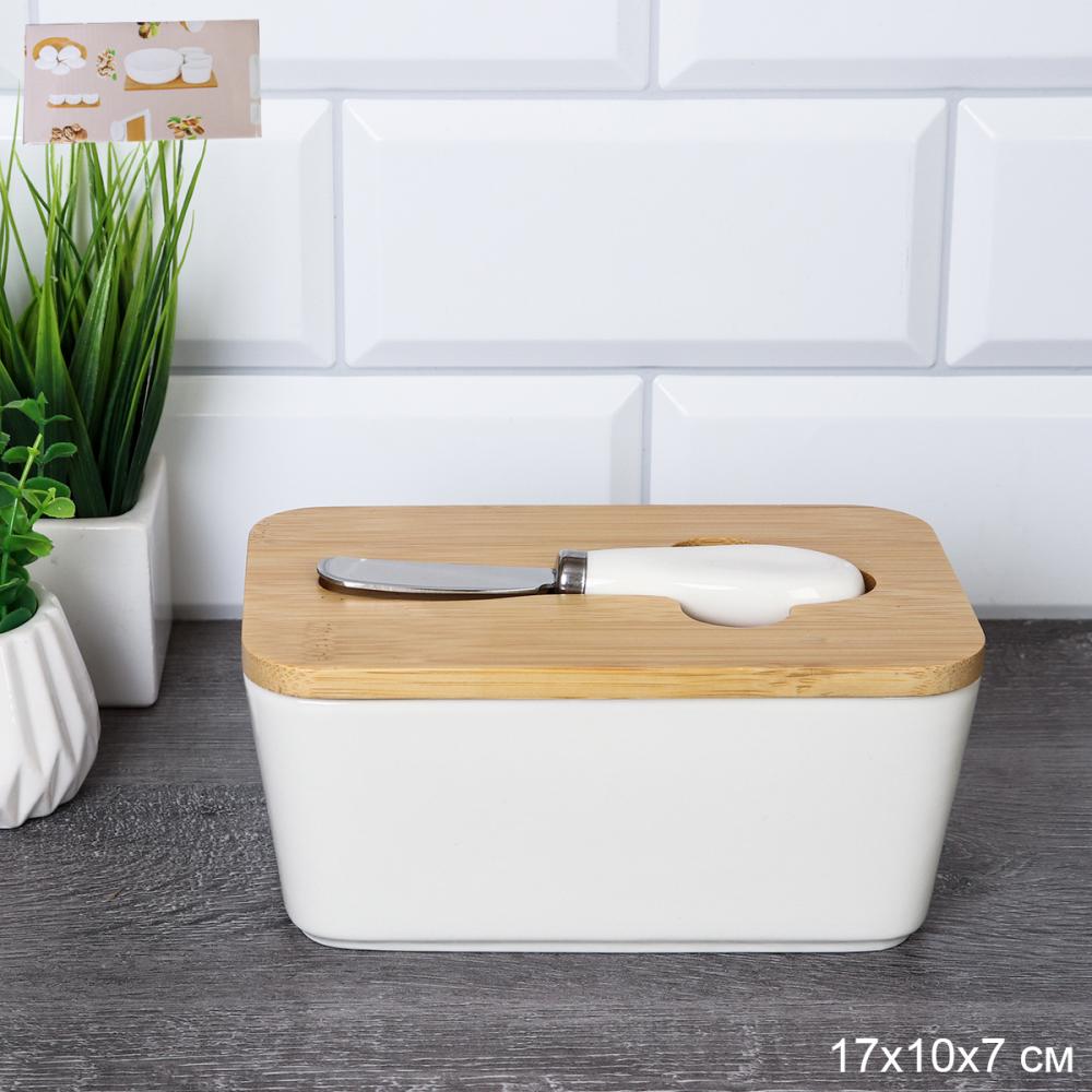 Керамическая масленка с ножом 13 см на деревянной крышке.
