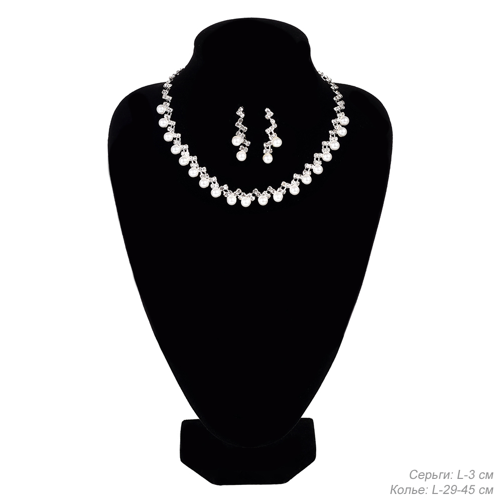 Колье со стразами и серьги гвоздики 3 см / 6395 /уп 12/серебро/жемчуг