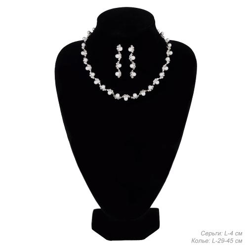 Колье со стразами и серьги гвоздики 4 см / 6409 /уп 12/серебро/жемчуг
