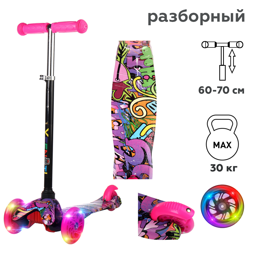 Самокат трехколесный для детей от 2-х лет Yeenot GT4105P15, нагрузка до 30кг, вес 1,8кг, светящиеся колёса PU 110мм, цвет граффити Glamour БК/уп10