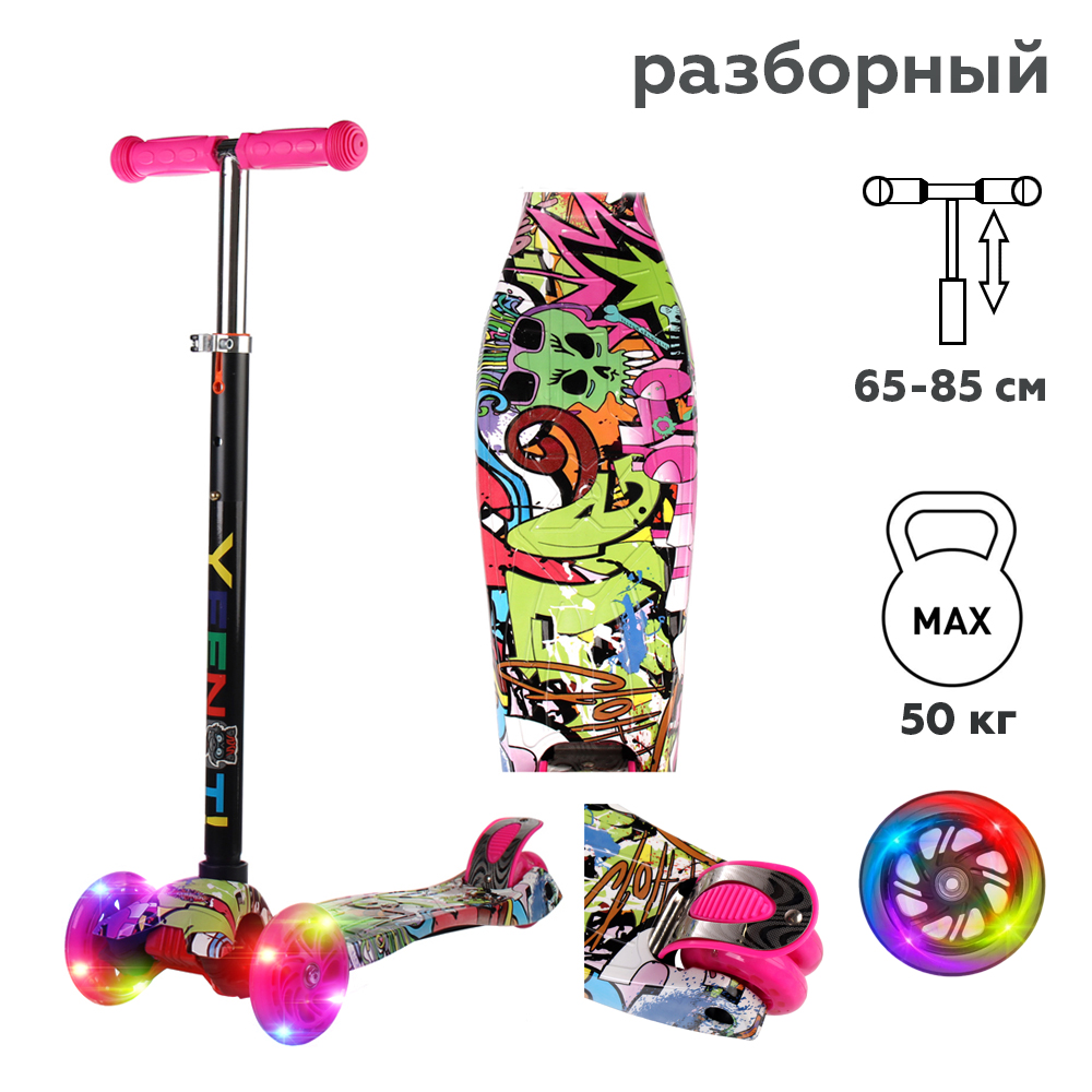 Самокат трехколесный для детей от 3-х лет Yeenot GT4108P15, нагрузка до 50кг, вес 2.3кг, светящиеся колёса PU116мм, цвет граффити Glamour БК/уп10