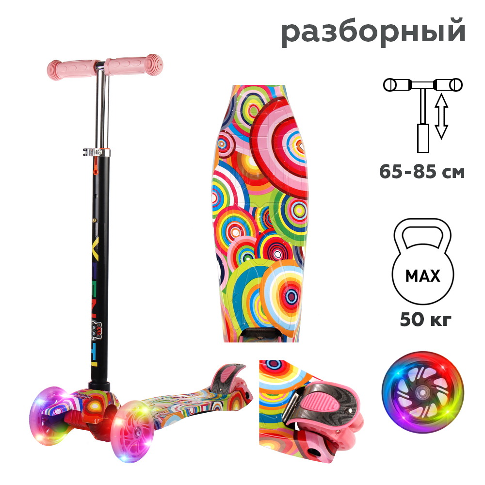 Этот самокат создан специально для маленьких покорителей дворов и парков. Благодаря трехколесной конструкции и увеличенной грузоподъемности до 50 кг, он идеально подходит для детей от 3 лет и станет надежным спутником в их первых приключениях. А яркая, оригинальная принтованная дека выделяет самокат из общей массы, подчеркнёт индивидуальность и сделает покатушки ещё веселее.