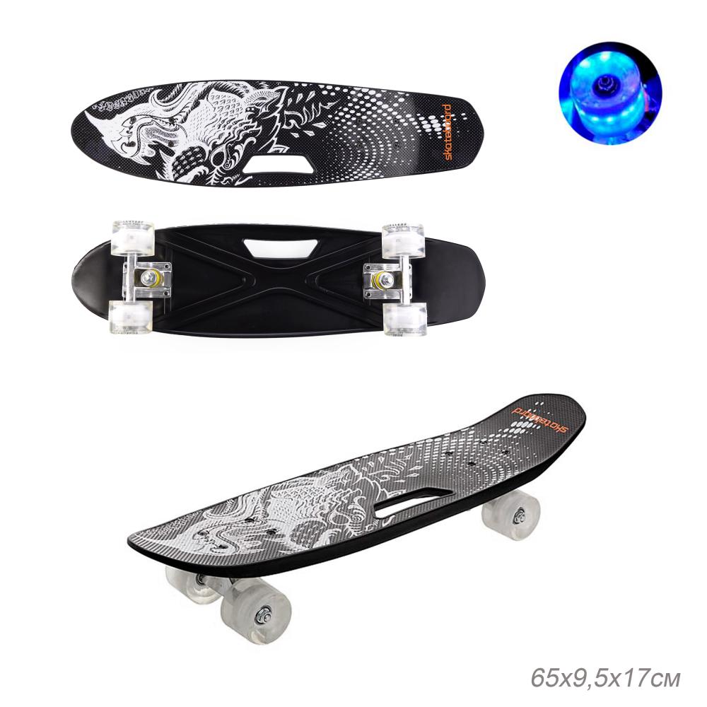 Отличительной чертой этого скейта являются светящиеся при езде колеса. Подойдет как для начинающих райдеров, так и уже опытным скейтерам.