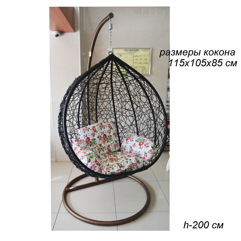 Кресло плетеное, подвесное, черное, из ротанга, усиленная стойка из металла, в комплекте с удобными подушками.