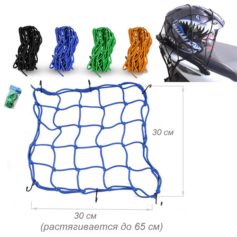 Багажная сетка предназначена для крепления шлема, рюкзака и других предметов на хвосте мотоцикла, багажниках квадроцикла или снегохода. Крючки выполнены из пластика, что предотвращает появление царапин. Растягивается до 65 см