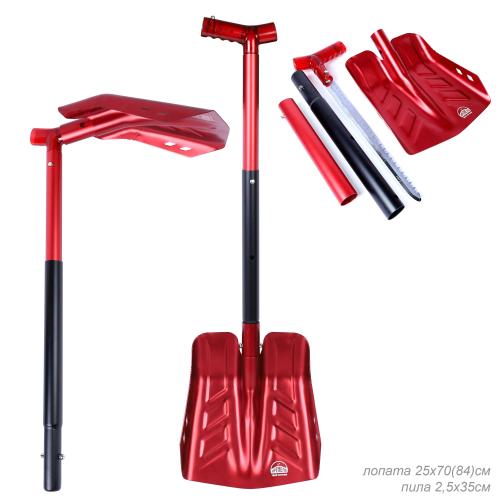 Лопата лавинная алюминиевая ИРЕМЕЛЬ СНЕГОВИК IR515 двухсекционная, с пилой 35см, T-образная рукоять, длина 84/70см, лезвие 28x25см, чёрно-красная/уп10