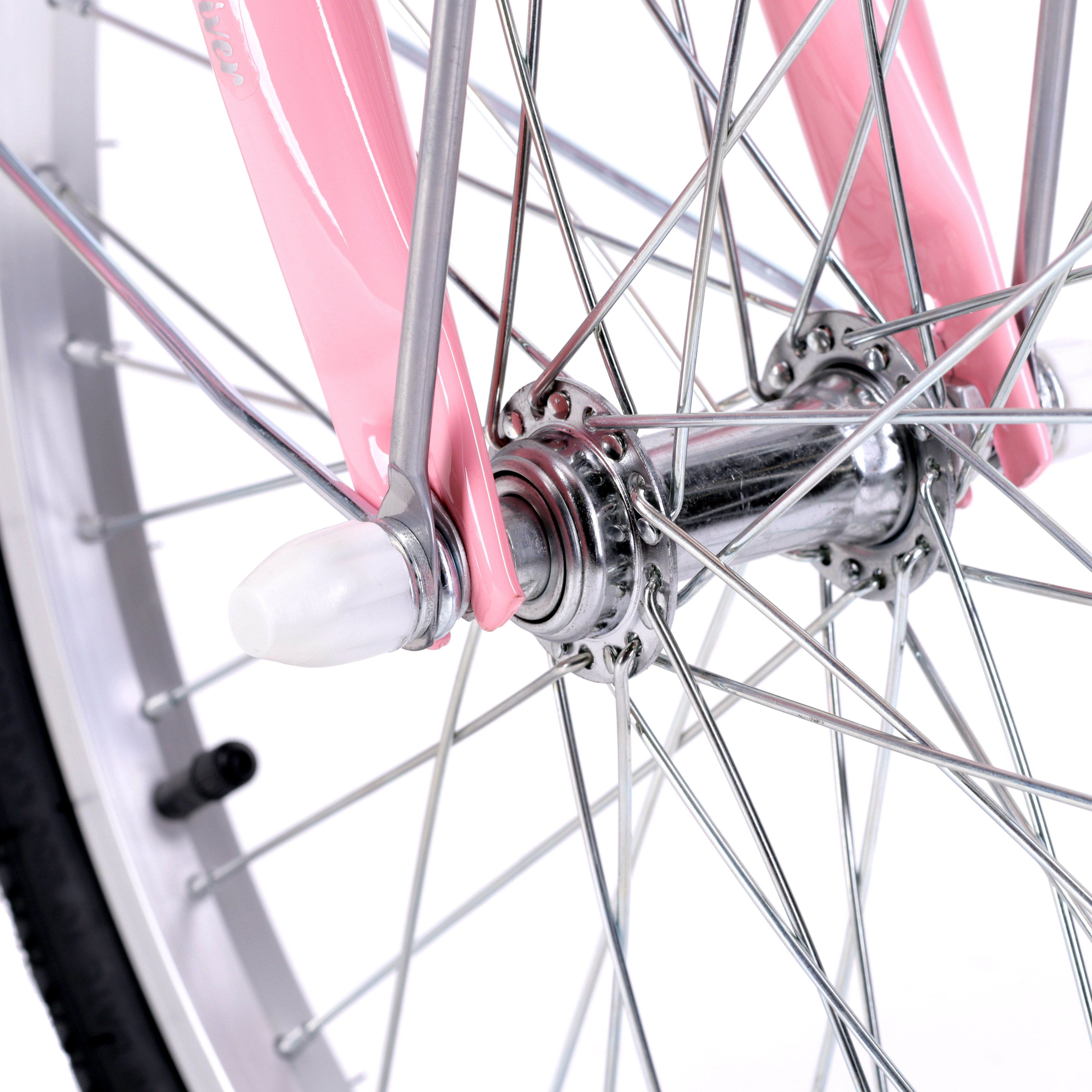 Велосипед доступен в трех нежных оттенках: нежно-розовом, лунной зелени и цветочном красном. Высококачественное лакокрасочное покрытие защищает велосипед от коррозии и сохраняет его яркий внешний вид на долгие годы. Элементы из экокожи, такие как грипсы и седло, придают велосипеду элегантный и современный вид. Белые педали типа small diamond, полноразмерные крылья и хромированные элементы завершают образ этого стильного городского велосипеда.