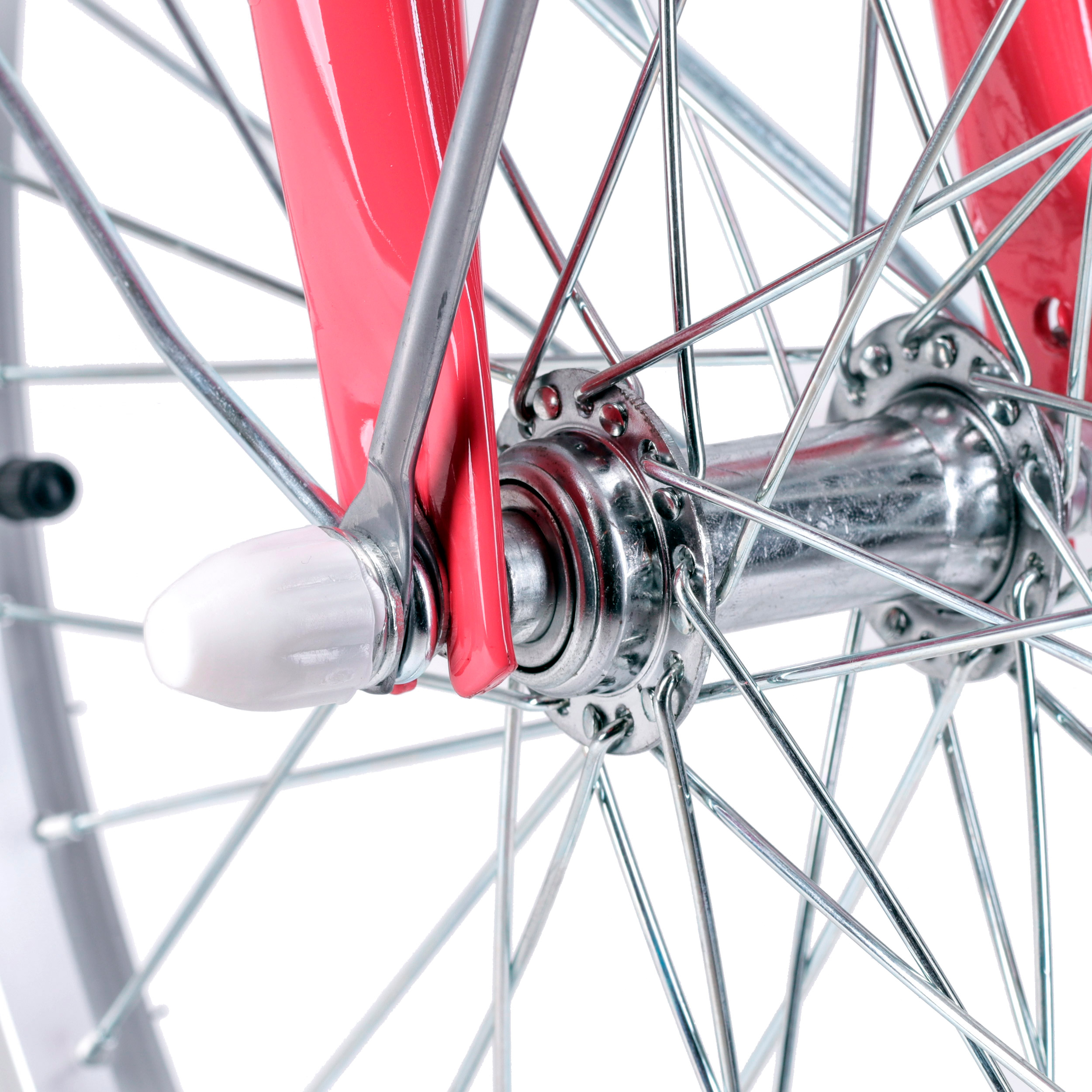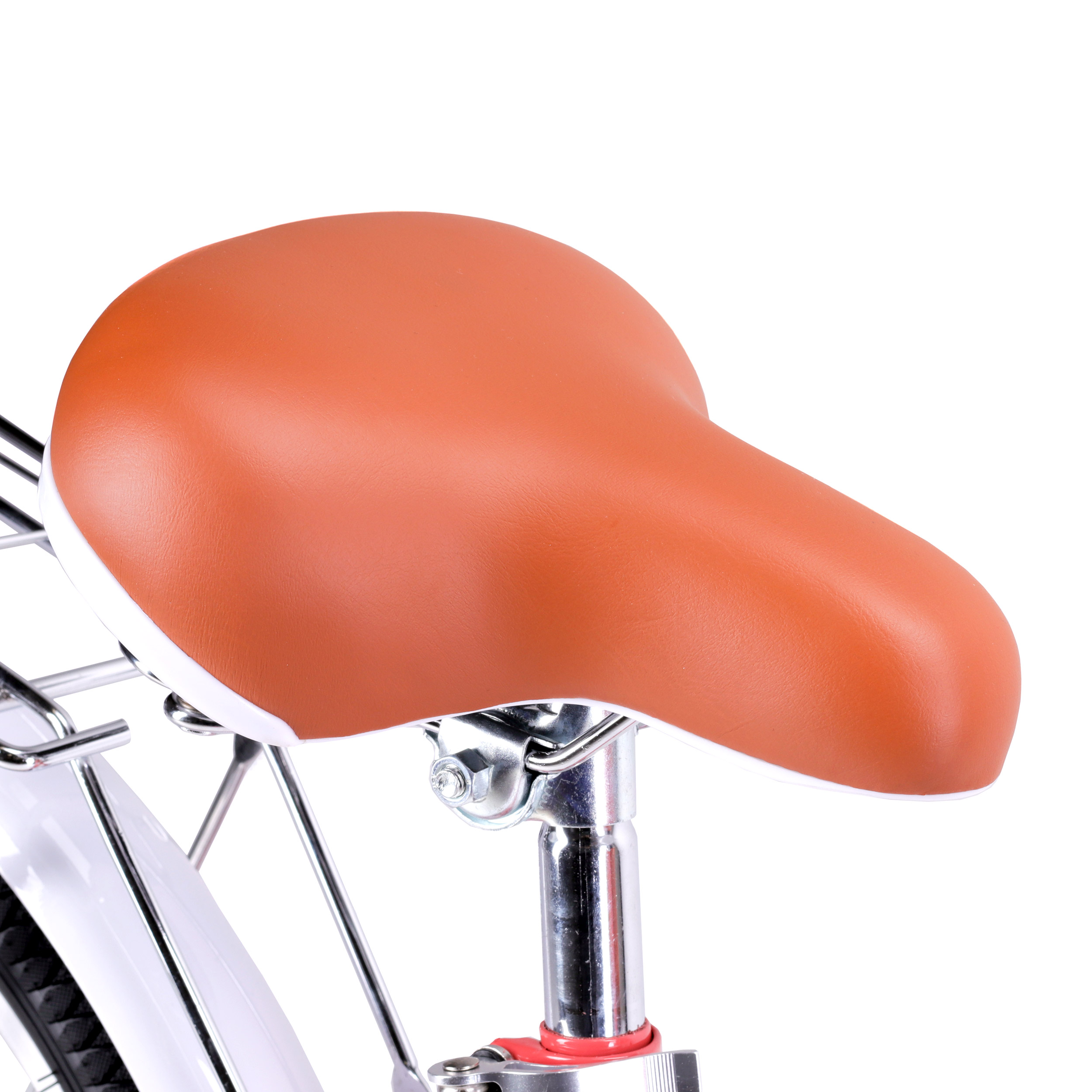 Велосипед доступен в трех нежных оттенках: нежно-розовом, лунной зелени и цветочном красном. Высококачественное лакокрасочное покрытие защищает велосипед от коррозии и сохраняет его яркий внешний вид на долгие годы. Элементы из экокожи, такие как грипсы и седло, придают велосипеду элегантный и современный вид. Белые педали типа small diamond, полноразмерные крылья и хромированные элементы завершают образ этого стильного городского велосипеда.