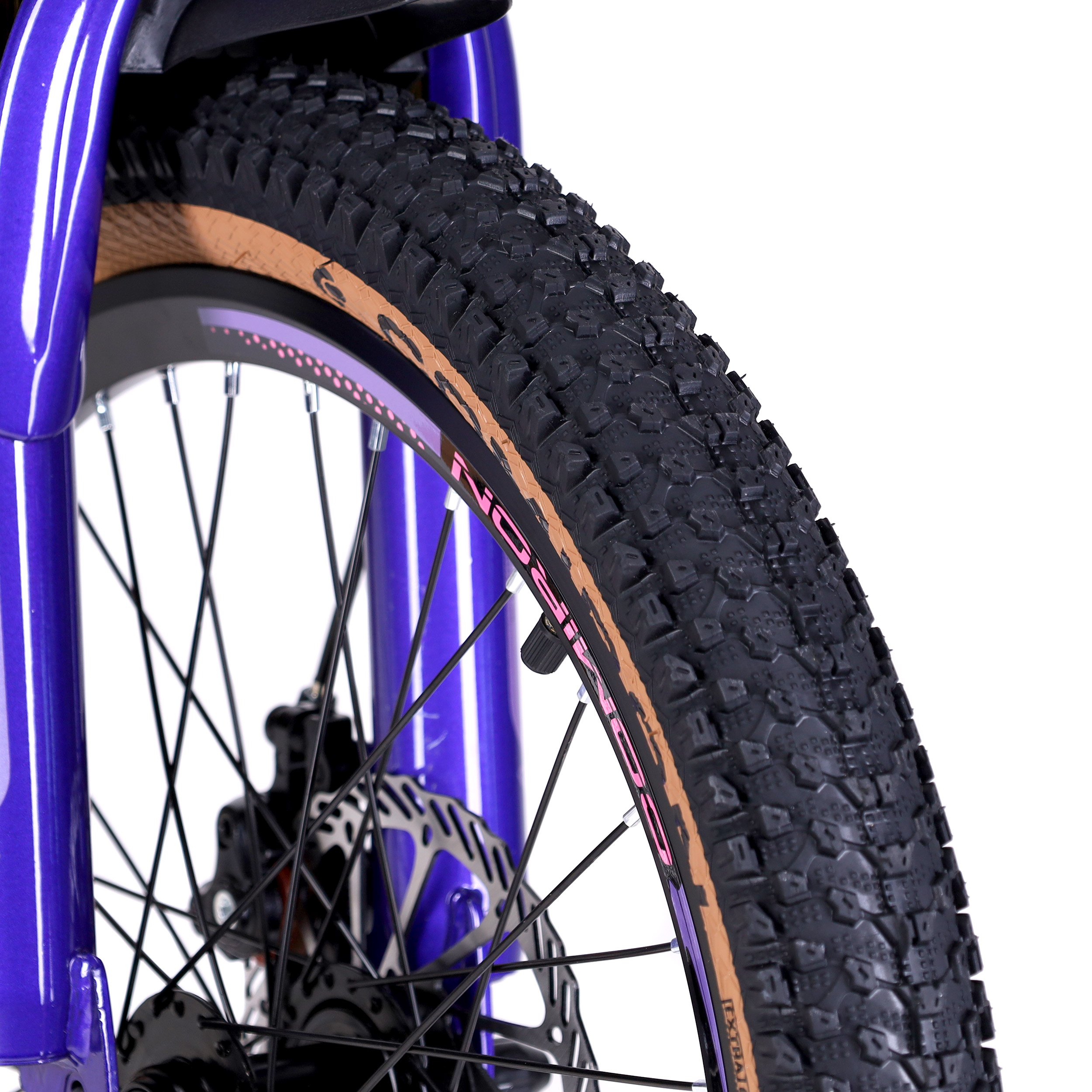 - Покрышки 20" x 2,35": Универсальная резина с выразительным протектором обеспечивает отличное сцепление как на асфальте, так и на грунтовых дорогах, а двухцветное исполнение с модными «кофейными» боковинами придают велосипеду индивидуальность и отличный внешний вид.