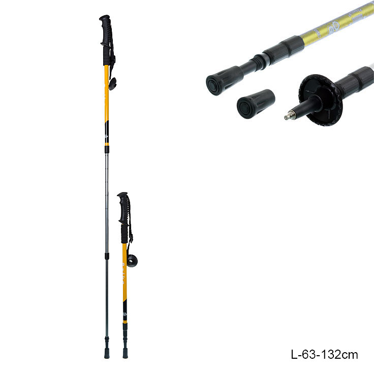 Телескопическа стойка палки изготовлена из специальных легких, но ультрапрочных материалов. Стойка палки - трехсекционная, в нижних двух секциях расположена метрическая разметка для быстрой и точной регулировки длины под рост. Удобную систему фиксации обеспечивает плавная регулировка высоты Винтовым (цанговым) зажимом. Фиксирует секции поворотом трубок вдоль оси в противоположных направлениях относительно друг друга.. Рукоять выполнена из каучука, обеспечивает комфортный и точный хват; эргономичный темляк регулируется. Он надевается на запястье и обеспечивает дополнительную безопасность пользователю при использовании палок. Палки оснащены системой быстрого отсоединения наконечника, Наконечники изготавливаются из износоустойчивых твердосплавных материалов, чаще всего из карбида вольфрама (их еще называют победитовыми наконечниками). При ходьбе по рыхлому грунту пользователь может установить дополнительное опорное кольцо сверху наконечника.