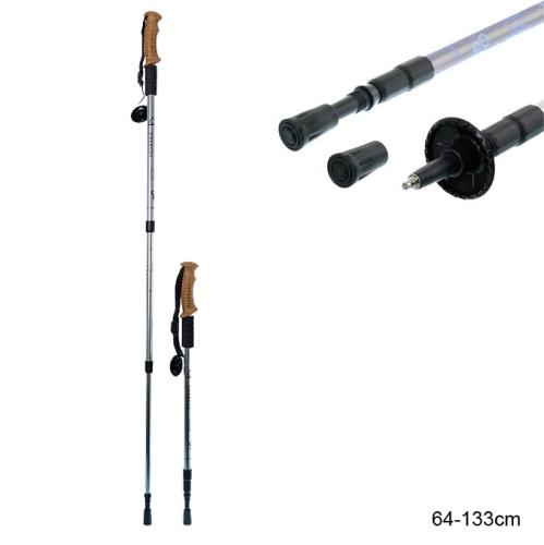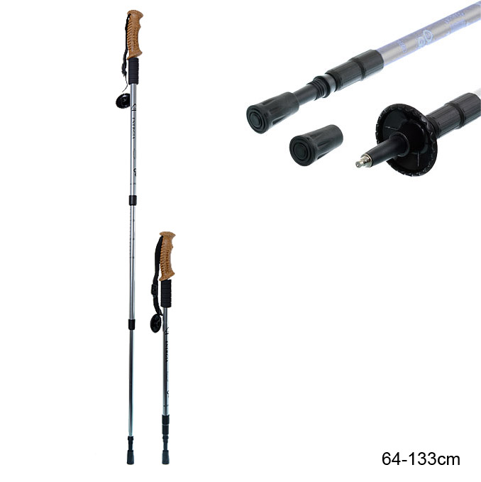 Телескопическа стойка палки изготовлена из специальных легких, но ультрапрочных материалов. Стойка палки - трехсекционная, в нижних двух секциях расположена метрическая разметка для быстрой и точной регулировки длины под рост. Удобная система фиксации обеспечивает плавную регулировку высоты Винтовой (цанговый) зажим. Фиксирует секции поворотом трубок вдоль оси в противоположных направлениях относительно друг друга. Рукоять выполнена из пробки, которая обеспечивает комфортный и точный хват; эргономичный темляк регулируется. Он надевается на запястье и обеспечивает дополнительную безопасность пользователю при использовании палок. Палки оснащены системой быстрого отсоединения наконечника, Наконечники изготавливаются из износоустойчивых твердосплавных материалов, чаще всего из карбида вольфрама (их еще называют победитовыми наконечниками). При ходьбе по рыхлому грунту пользователь может установить дополнительное опорное кольцо сверху наконечника. Модель дополнительно имеет опцию – система «анти-шок» a. В рукоятку или в первую, самую толстую секцию вмонтирована пружина, которая смягчает отдачу при ударе палки о твердую поверхность. Это особенно актуально в горных походах.