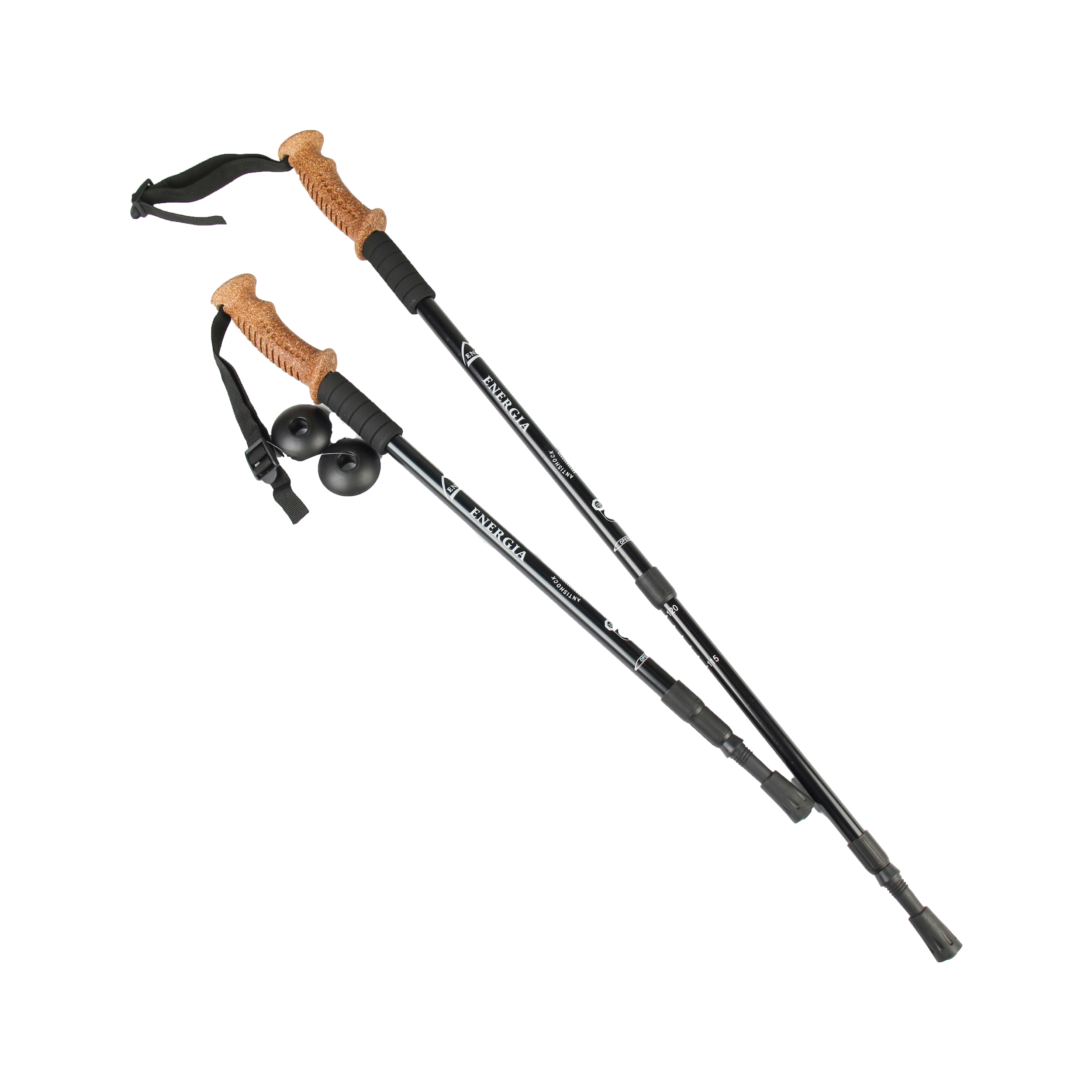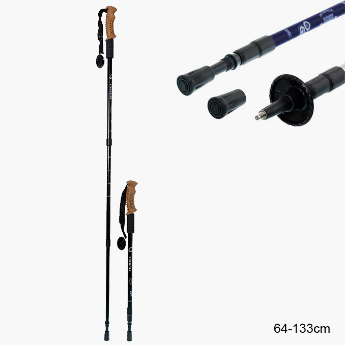 Телескопическа стойка палки изготовлена из специальных легких, но ультрапрочных материалов. Стойка палки - трехсекционная, в нижних двух секциях расположена метрическая разметка для быстрой и точной регулировки длины под рост. Удобная система фиксации обеспечивает плавную регулировку высоты Винтовой (цанговый) зажим. Фиксирует секции поворотом трубок вдоль оси в противоположных направлениях относительно друг друга. Рукоять выполнена из пробки, которая обеспечивает комфортный и точный хват; эргономичный темляк регулируется. Он надевается на запястье и обеспечивает дополнительную безопасность пользователю при использовании палок. Палки оснащены системой быстрого отсоединения наконечника, Наконечники изготавливаются из износоустойчивых твердосплавных материалов, чаще всего из карбида вольфрама (их еще называют победитовыми наконечниками). При ходьбе по рыхлому грунту пользователь может установить дополнительное опорное кольцо сверху наконечника. Модель дополнительно имеет опцию – система «анти-шок» a. В рукоятку или в первую, самую толстую секцию вмонтирована пружина, которая смягчает отдачу при ударе палки о твердую поверхность. Это особенно актуально в горных походах.