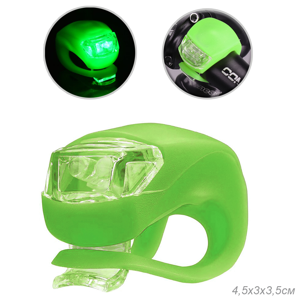 Фонарь LED в силиконовом корпусе на руль велосипеда скутера на шлем питание от батареек зеленый /уп 200/