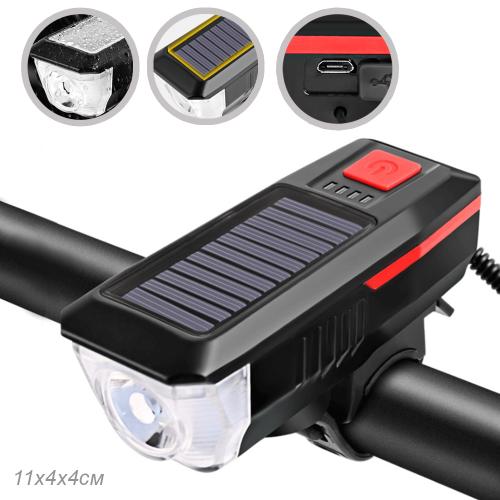 Фонарь передний COMIRON "SUN2" корпус ABS, свет T6, 350lm, 2000mAh, 3 режима, USB-micro, пульт ДУ, сигнал 120Дб, подзарядка от солнца, кра /уп 100/