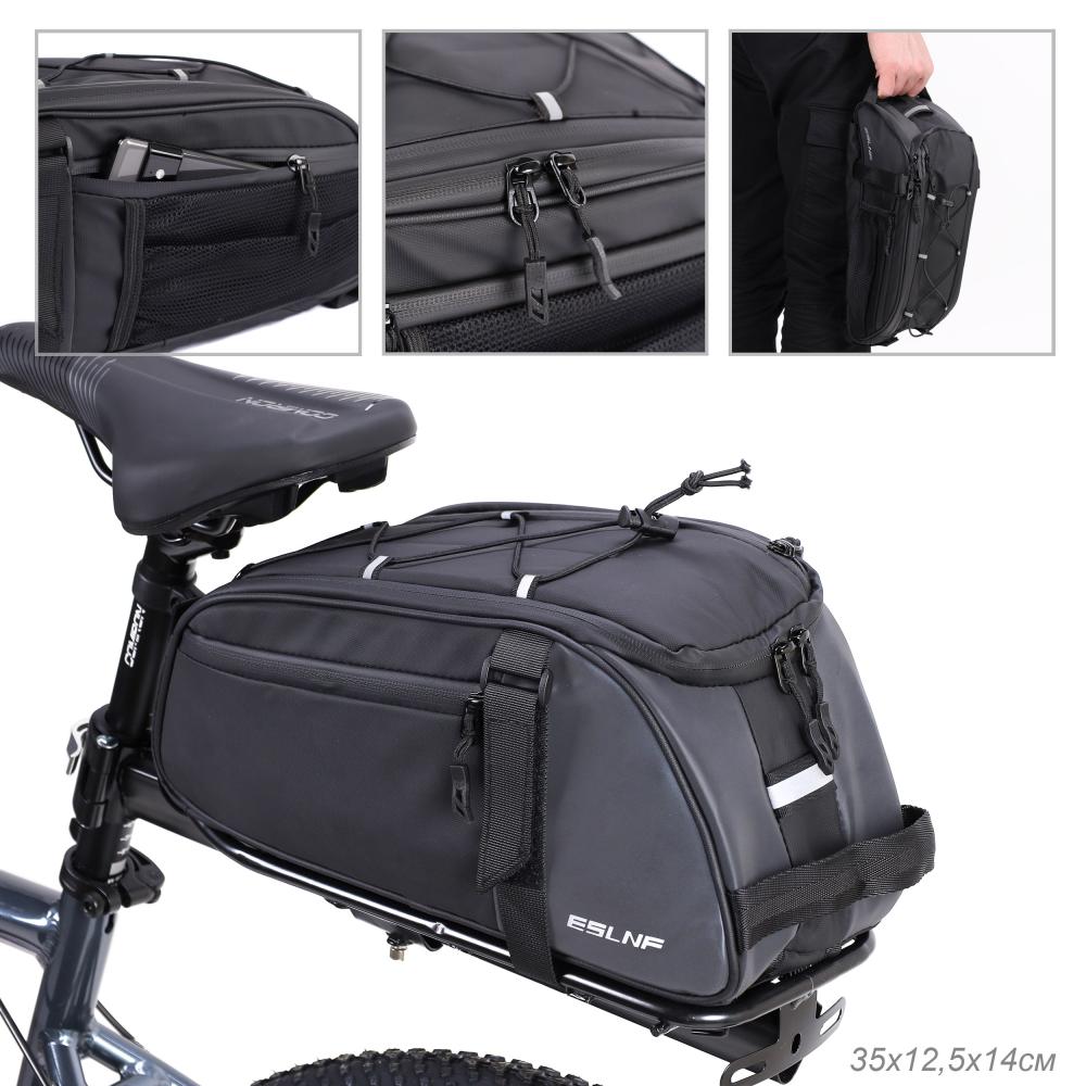 Сумка велосипедная на багажник ESLNF, основные отсеки на молнии, крепление velcro, боковые отсеки на молнии и с сеткой. Размер 12.5*35*14см. /уп 40/