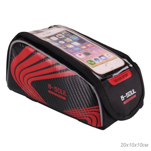 Сумка велосипедная на раму BICYCLE SOUL TPU стенки корпуса с отделением для смартфона основной отсек на липучке velcro чёрно-красная 21х9х10см /уп 50/